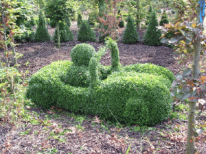 De coniferen en buxussen in alle vormen, dat is waar het over gaat. Wie heeft dat uitgevonden? Waarom doen mensen zoiets? Ik vind het niet natuurlijk, ik heb nog nooit in een bos rondgelopen waar ze speelgoedstruiken op natuurlijke wijze gevormd hebben.  Wie beslist zoiets?