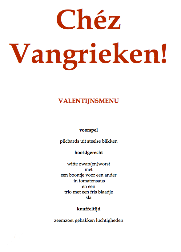 Valentijn dus, een niet aflatende bron van ergernis voor me, elk jaar opnieuw, gewoon omdat ik het zo’n aanfluiting van ons verstand vind. Willen we daar nu eens mee stoppen? Volgens mij kan er niemand tegen zijn. De restaurants niet, de venten niet, en de vrouwen niet, tenminste als iedereen een beetje mee wil.