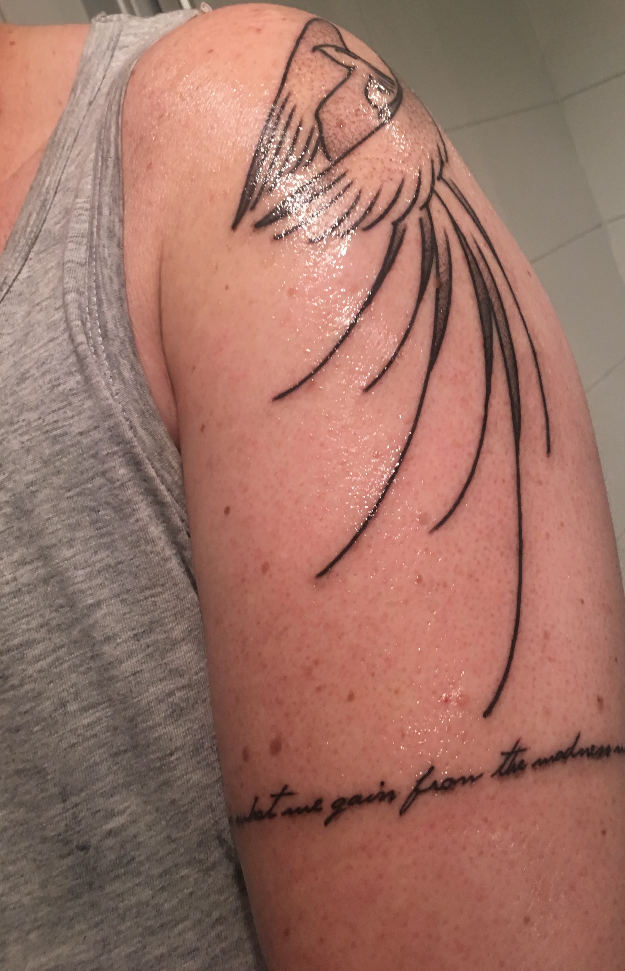 Mijn eerste tattoo was op mijn 19, na een serieuze lichamelijke ingreep wezen een hoop gatachterlijke mensen mij na. “Kijk die eens, amai, da is erg, lelijk,… ” na een tijdje ben je dat kotsbeu en dan hoor je dat je beste vriend een tattoo laat zetten. Enkele weken later was ik de trotse eigenaar van mijn eerste en toen overtuigd laatste tattoo. We zijn nu 27 jaar verder, er staan er reeds 4 op mijn lichaam en het aantal gaat nog stijgen. Net als jij hou ik van de geschreven en gesproken taal, een wit blad is een mooie canvas voor woorden, mijn huid is een mooie canvas voor dat wat ik mooi vind in beelden uitgedrukt.