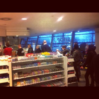 En dan kom je ’s avonds in datzelfde ding, wil je een flesje water, of godweetwat… en dan zijn de kassa’s gesloten, behalve dat eentje waar een schaap zit te blazen en aan een Poolse trucker probeert uit te leggen dat Calais in de andere richting is. Kid you not.